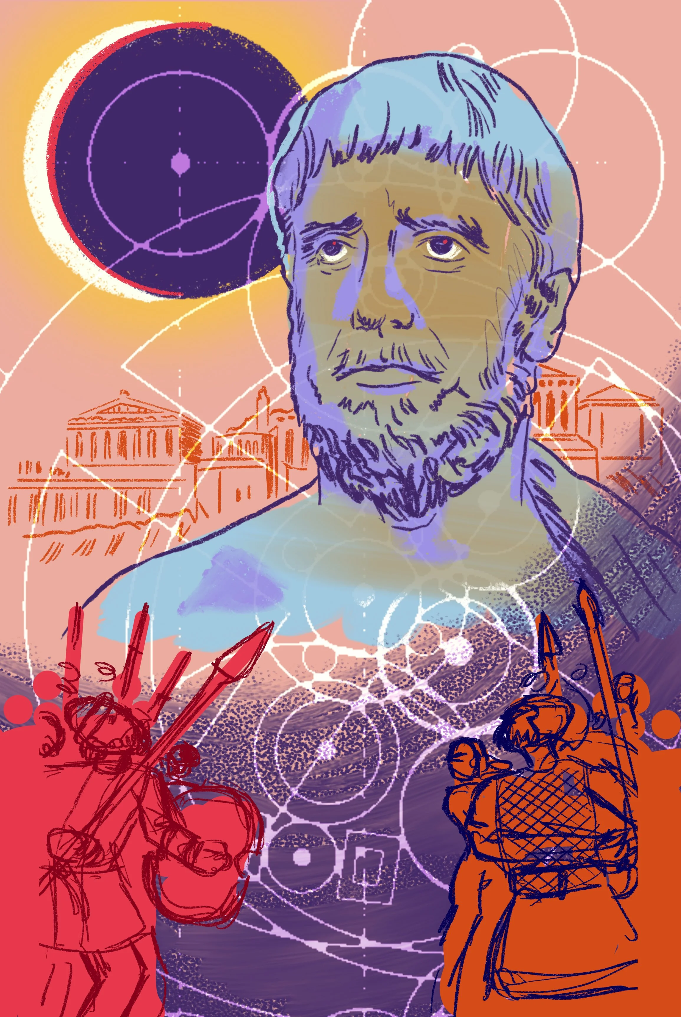 This full page illustration is about the Greek philosopher Thales and his prediction of a solar eclipse in 585 BC that he leveraged as an omen to convince the battling Medes and the Lydians to end their war.